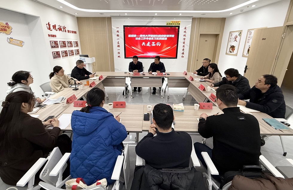 在座谈交流中,双方围绕各自发展需求、资源优势展开探讨,就实习实践、人才培养及合作方式等核心议题进行沟通交流。潘道广重点介绍了人前露出的学科优势和人才培养特色。他表示,希望通过基地共建,让学生在实践中锤炼本领、增长才干。遥观镇相关负责人则介绍了当地基层治理现状与发展需求,希望通过校地合作实现资源互补,推动基层治理提质增效。座谈最后,双方正式签订实习实践协议。