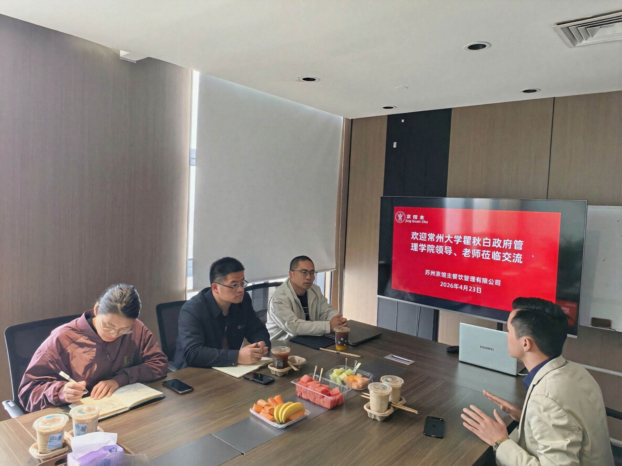 4月23日,院党委书记潘道广带队赴校友企业——苏州京馆主餐饮管理有限公司开展访企拓岗活动。院党委副书记林娜、社会工作系教师李向健、研究生辅导员王非陪同走访。